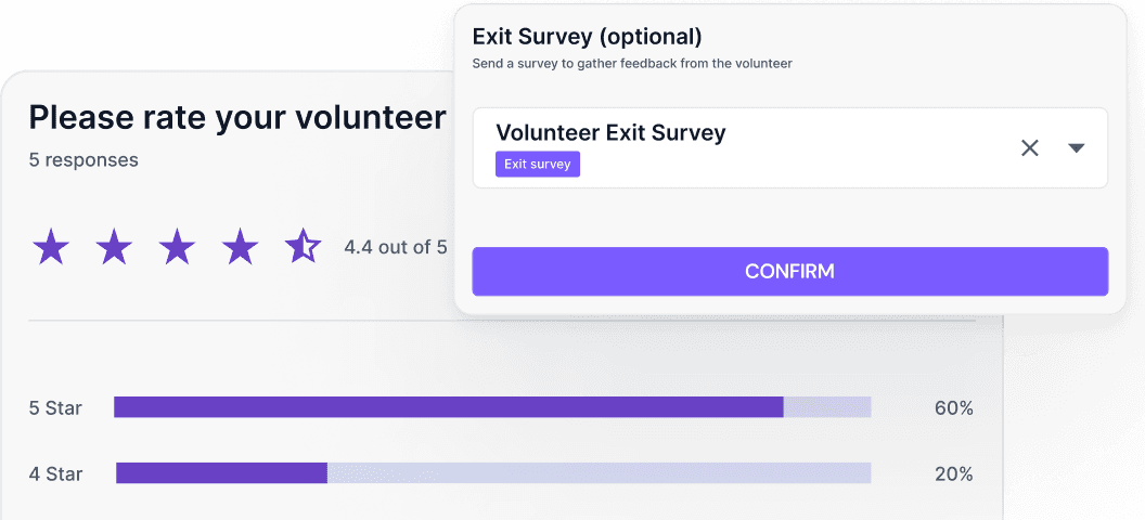 Collect feedback from volunteers through our native survey feature. Automatically send exit surveys to leaving volunteers. Equip your organisation with the data it needs to improve your volunteer program.