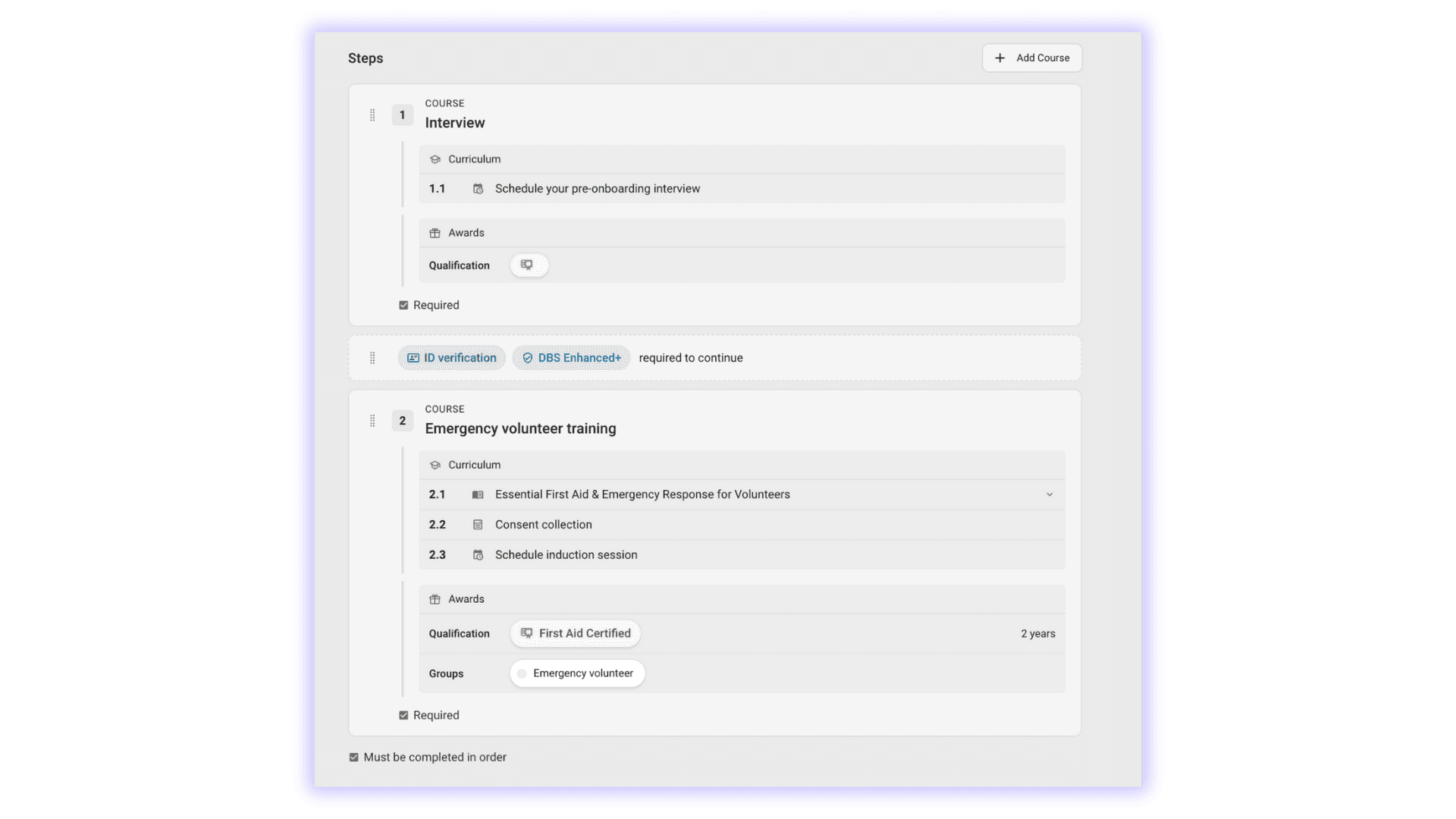 Volunteero advantage: A native E-Learning / Learning Management System (LMS) within the platform. Not only can this save you significant money, it also provides the most seamless experience for volunteers managing onboarding and training in one place. Even better, it means Volunteero can handle renewals and ongoing compliance automatically.